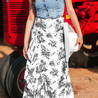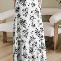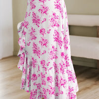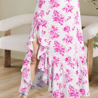 Design details: Boho floral print, high-waist silhouette, ruffled accents, and a stylish split maxi length with a subtle, flattering drape.