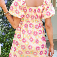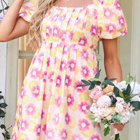 Design Details: Floral print, square neckline, puff sleeves, and a pleated skirt that flares into a flattering midi length.