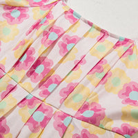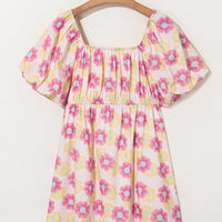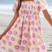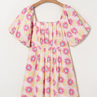 Floral Square Neck Puff Sleeve Pleated Flared Midi Dress