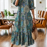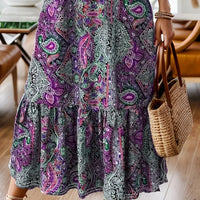 Embrace boho-chic charm with this Full Size Bohemian Paisley Print Ruffle Hem Midi Dress, crafted for plus-size wearers who love a vibrant print and feminine details. The midi length and ruffle hem offer effortless movement from day to night.