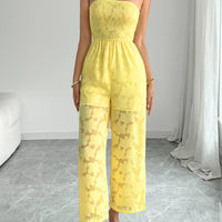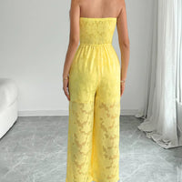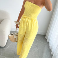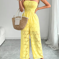 The Lace Smocked Tube Jumpsuit is a lightweight, one-piece ensemble designed for warm-weather outings. Its smocked bodice and sheer fabric create an elegant, easy-to-wear silhouette that onlookers will notice without complicated styling.