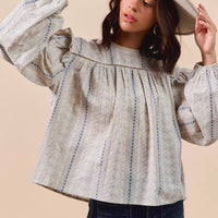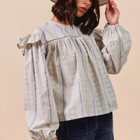 The blouse is ideal for pairing with your favorite jeans for a fresh daytime look or dressing up with a skirt for a polished evening ensemble. Its 100% cotton fabric offers breathable comfort, while the long sleeves and ruffles provide a romantic flair that remains tasteful and versatile through transitional seasons.