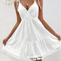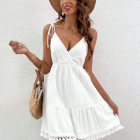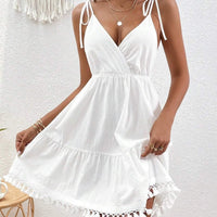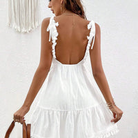 A lightweight cotton surplice mini dress designed for warm-weather moments. With a tied back, backless silhouette, and tassel hem, it offers a playful yet polished option for summer days and evenings.
