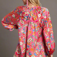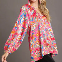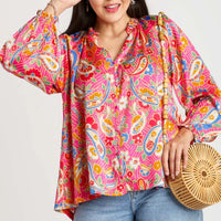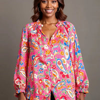 Celebrate bohemian sophistication with the Umgee Full Size Satin Paisley Ruffle Neck Button-Up Shirt. Designed for plus-size fashion lovers, this satin blouse pairs a vibrant paisley print with a feminine ruffle neck and versatile button-up styling for day-to-night wear.