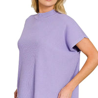 This sweater delivers everyday comfort with a relaxed, breathable design. The boxy silhouette drapes over jeans or skirts, while the lavender color makes it a versatile layer for both casual and polished looks. Easy-care fabric, mock neck, and short sleeves combine to create a go-to piece you can wear year-round.